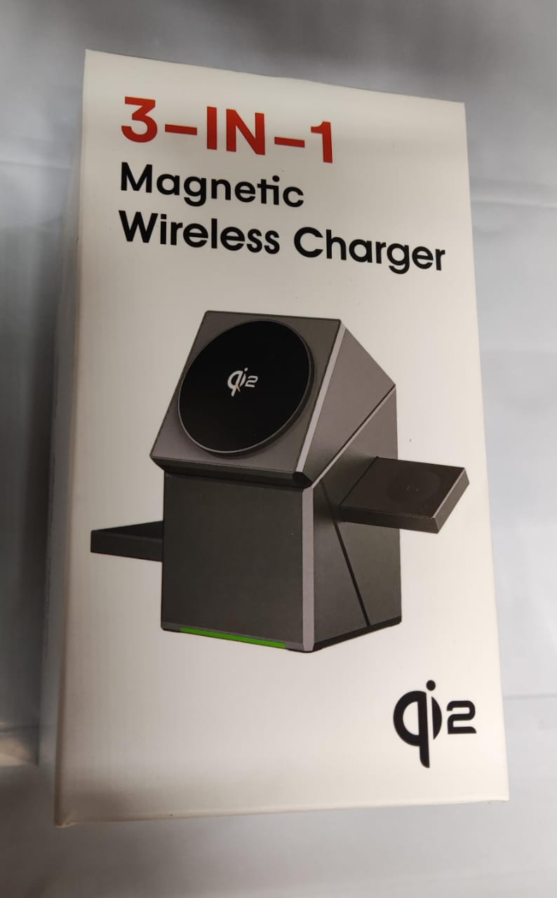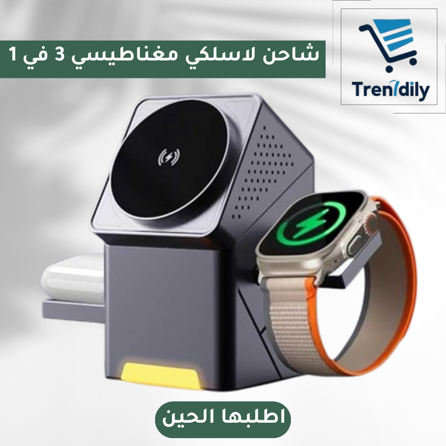 شاحن لاسلكي مغناطيسي 3-في-1 يشحن هاتف، ساعة، وسماعة في نفس الوقت. تصميم MagSafe / مغناطيسي قوي، حماية متقدمة، وشحن سريع وآمن.